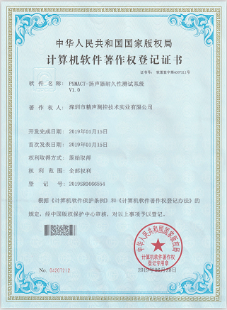 《PSMACT-揚(yáng)聲器耐久性測(cè)試系統(tǒng)》于2019年1月15日被正式授予《中華人民共和國(guó)國(guó)家版權(quán)局計(jì)算機(jī)軟件著作權(quán)登記證書(shū)》,登記號(hào)為2019SR0666554。
